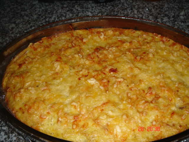 Pão ralado e azeitonas pretas. Leva ao forno a 180º, 12 min. e depois deixa gratinar até ficar dourado.